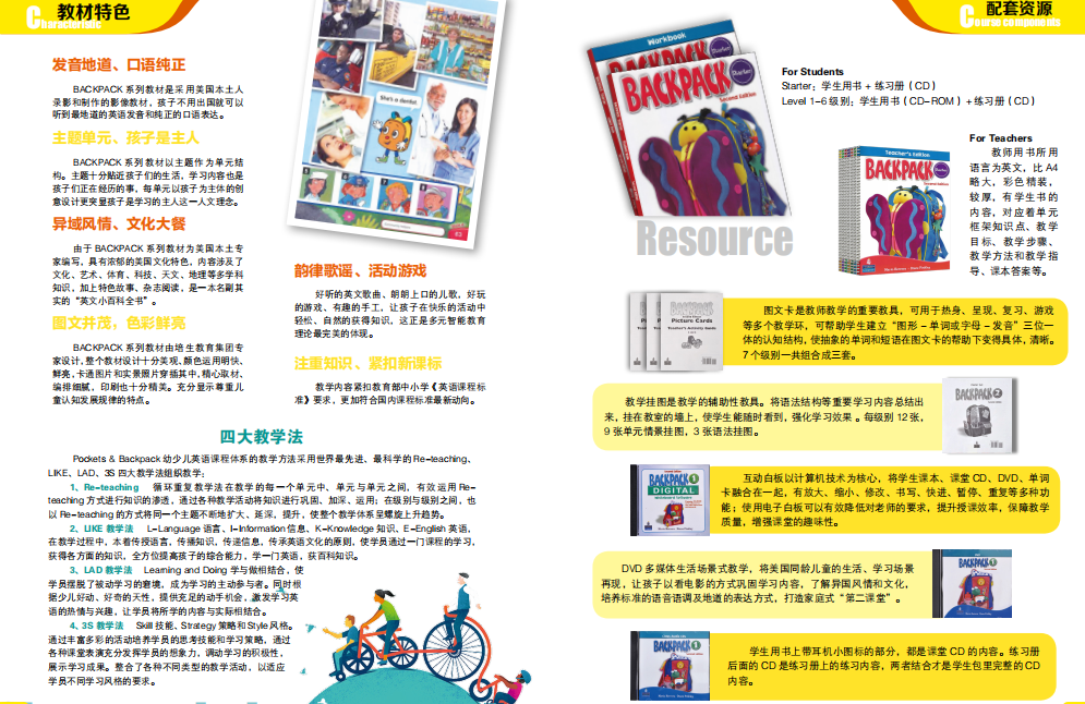 BACKPACK 教材被誉为“小百科全书”,书中内容丰富、生动。所有知识都会通过歌曲、歌谣、舞蹈、游戏、手工制作等形式体现在孩子面前。